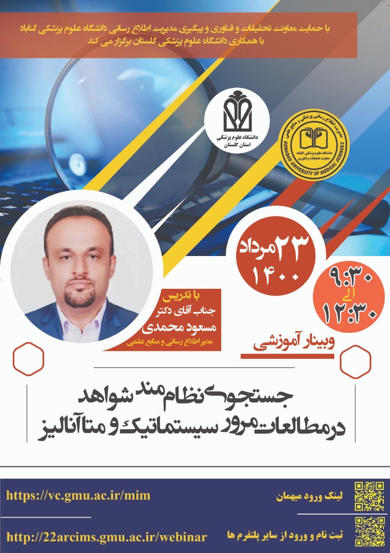 وبینار آموزشی «جستجوی شواهد بالینی در سیستماتیک ریویو و متا آنالیزها» با همکاری دانشگاههای علوم پزشکی گناباد و گلستان برگزار میشود.